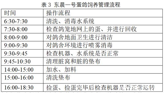 東晨一號蛋鴿配套有標準化飼養管理流程,飼養管理流程如表3
